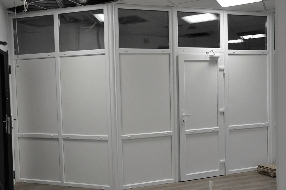 • Быстрый монтаж — установка стационарных пластиковых офисных перегородок чаще всего занимает 1 день