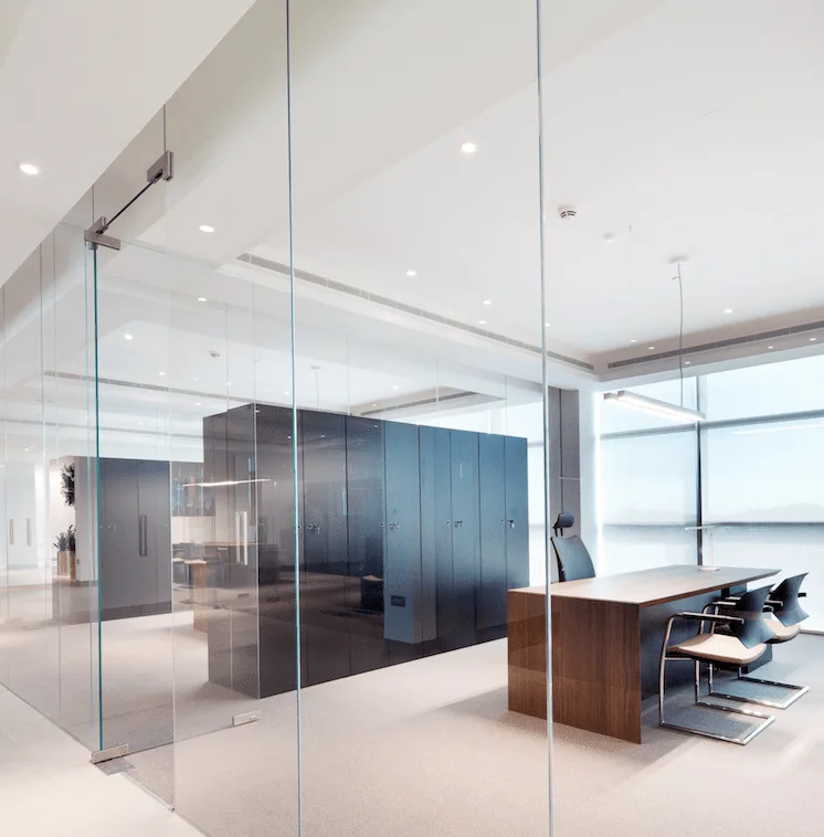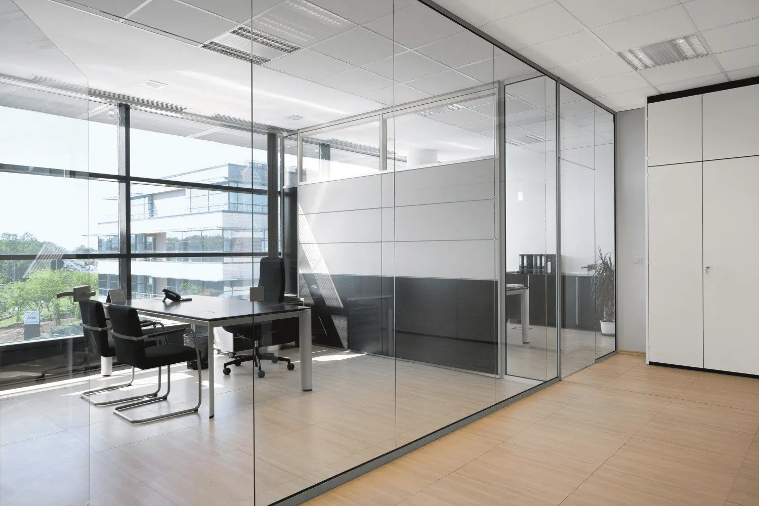 Стационарные офисные перегородки из стекла изготавливаются из закалённого безопасного стекла, которое рассчитано на длительную эксплуатацию и постоянные нагрузки. Такие перегородки для офиса применяются в кабинетной системе, переговорных, зонах open space, при создании отдельных рабочих блоков и административных помещений, где важно чёткое зонирование и стабильность конструкции. Стеклянные стационарные перегородки монтируются на профиль и становятся частью интерьера, обеспечивая визуальную лёгкость, свет и аккуратный внешний вид без ощущения замкнутости.